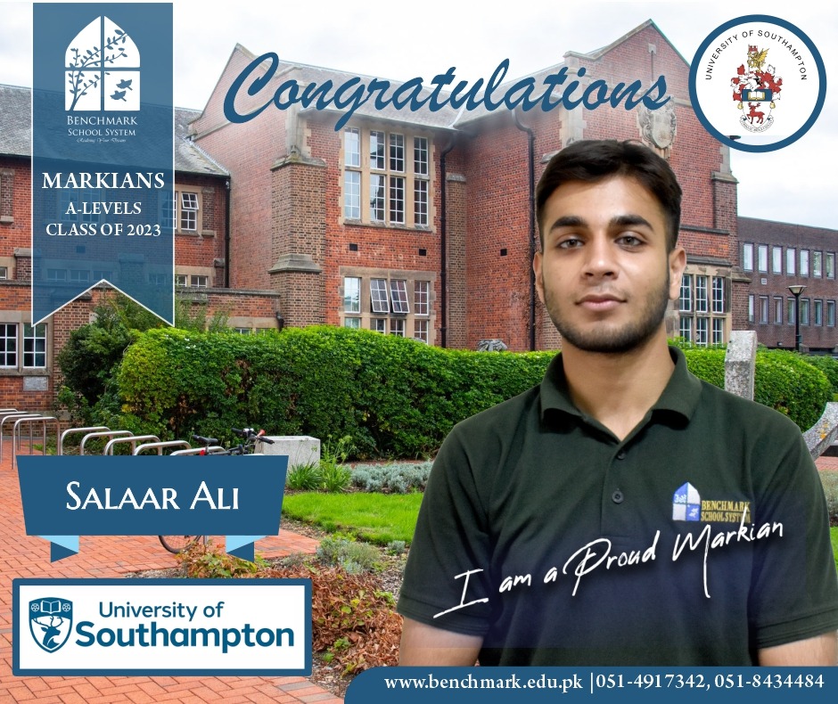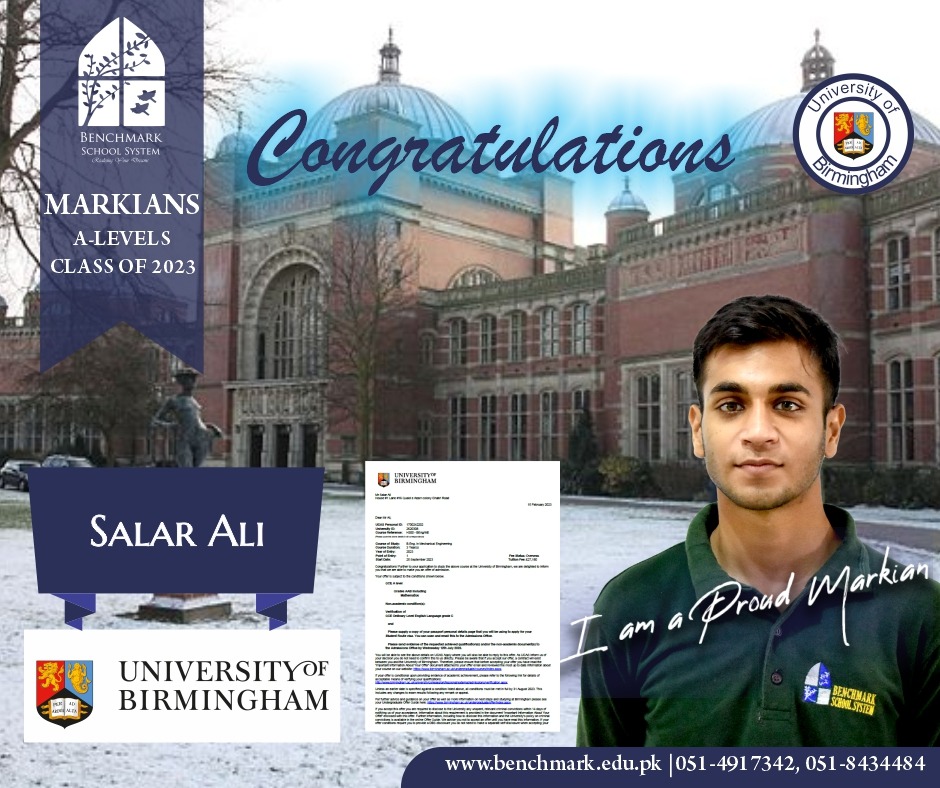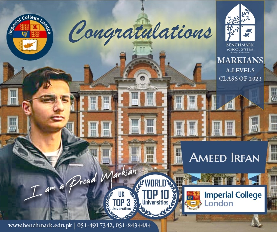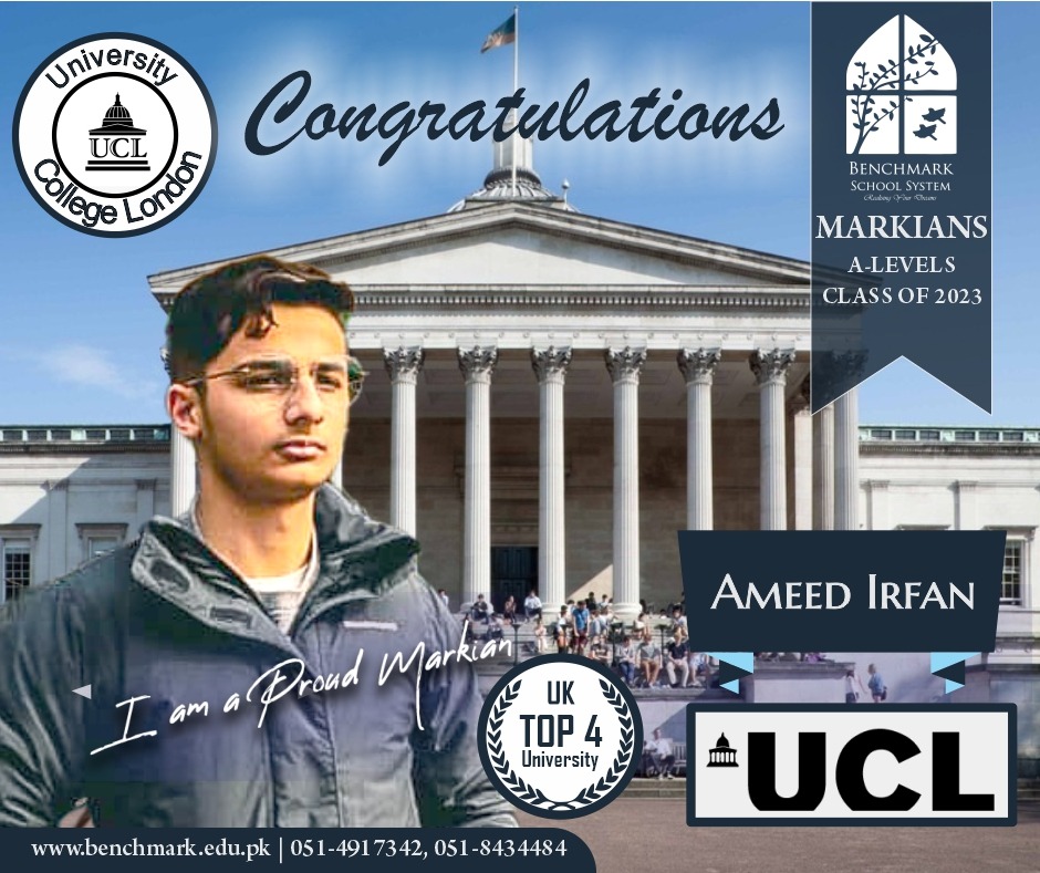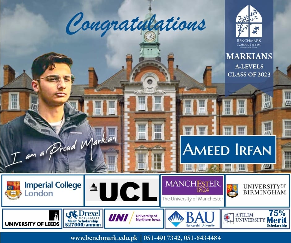 Benchmark School System takes great pride in its students who have secured placements at prestigious UK universities for the year 2023. From Imperial College London and University College London (UCL) to King’s College and the University of Southampton, our students’ accomplishments exemplify their dedication, hard work, and academic excellence. We commend them for their unwavering commitment to their studies and for representing our school with such distinction. These university acceptances are a testament to the exceptional education and nurturing environment that Benchmark School System provides, empowering students to reach new heights and pursue their dreams on an international stage.