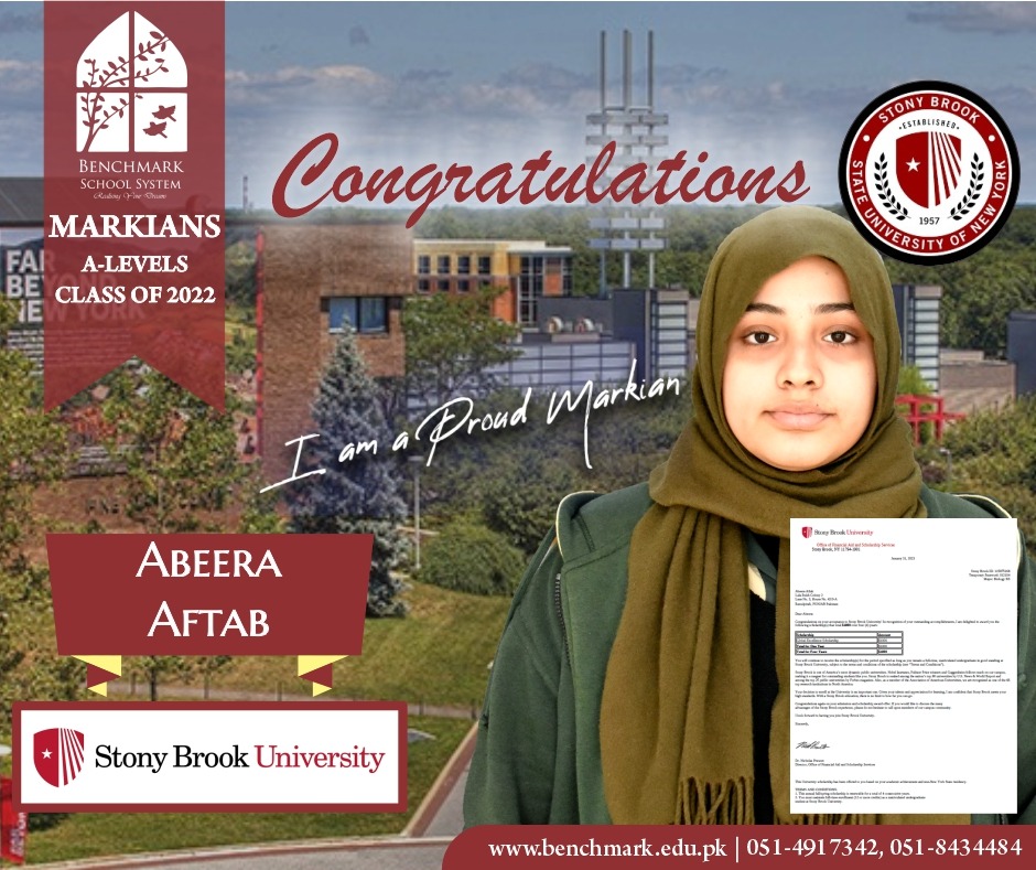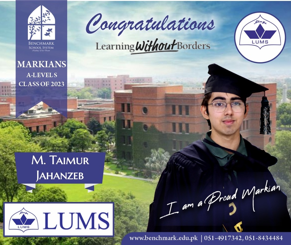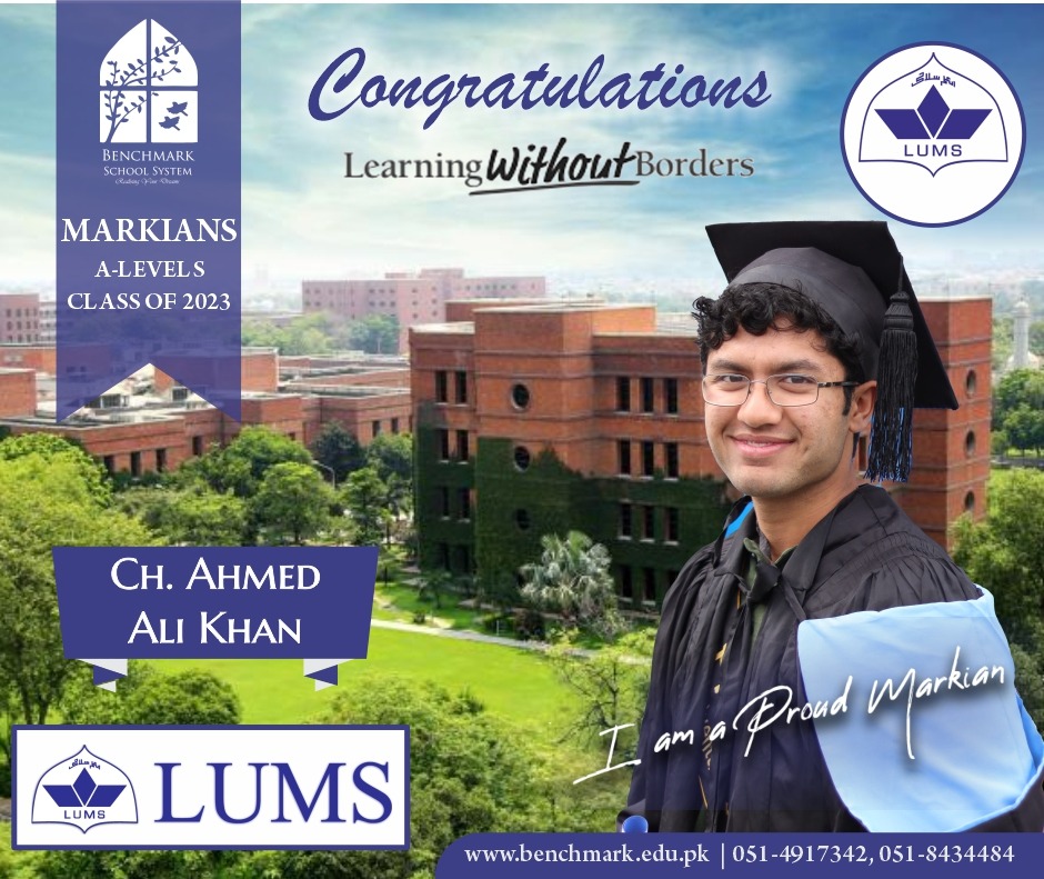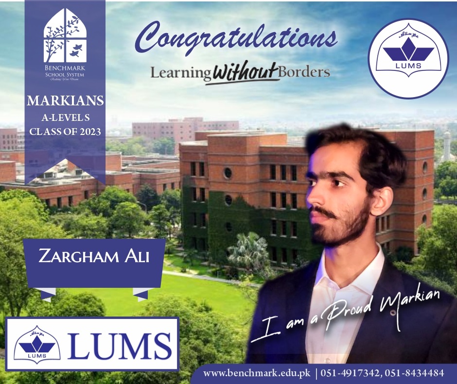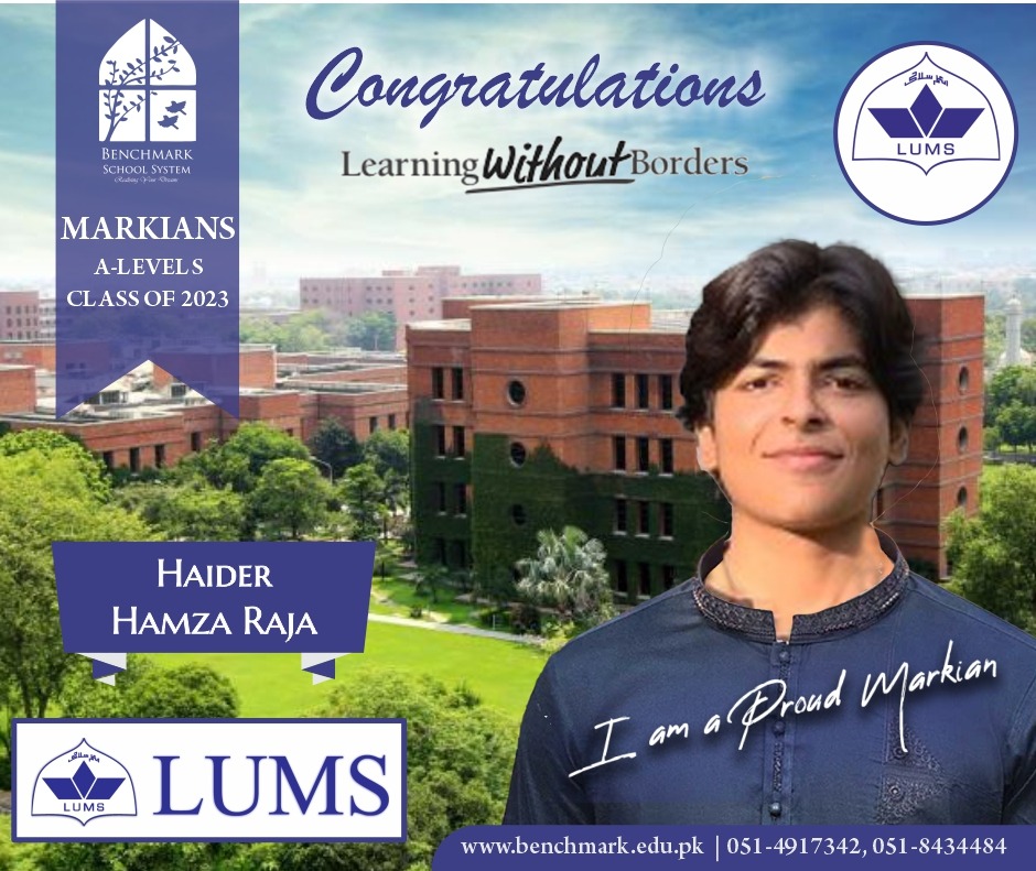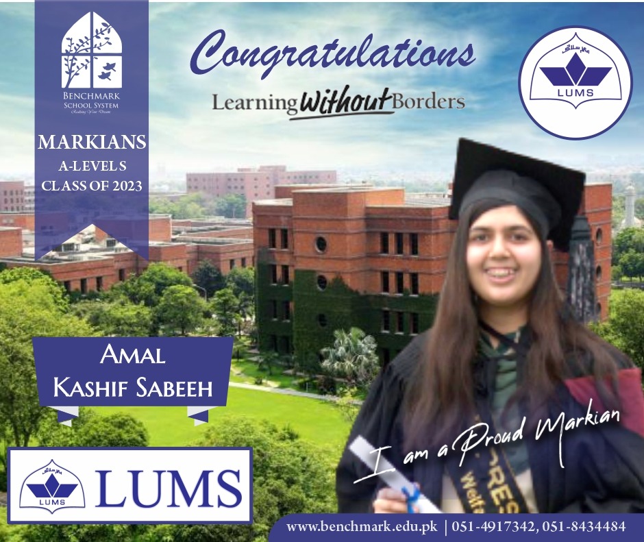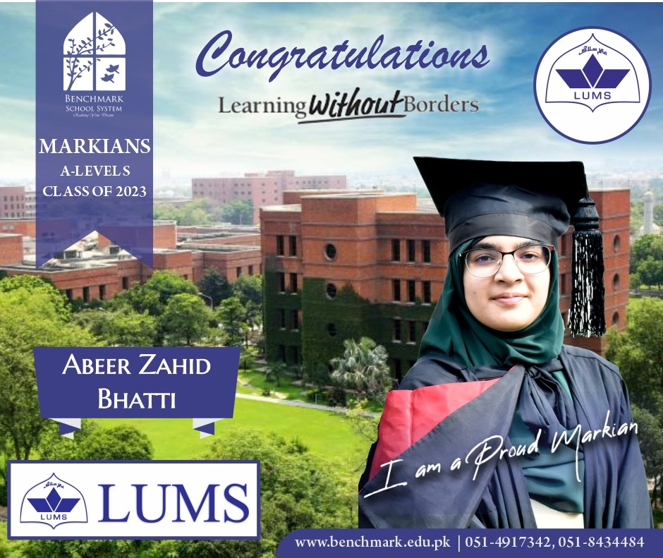 Benchmark School System takes great pride in its students who have secured placements at the one of the most prestigious institutions in Pakistan, Lahore University of Management Sciences (LUMS), for the year 2023. LUMS represents a pinnacle of academic excellence and innovation in higher education. Our students’ acceptance into LUMS is a testament to their unwavering commitment to their studies, as well as the dedication and support provided by our esteemed faculty and staff.