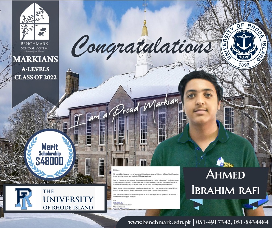 Benchmark School System takes great pride in its students who have secured placements at prestigious US universities with scholarships ranging from full ride to 90% for the year 2023.